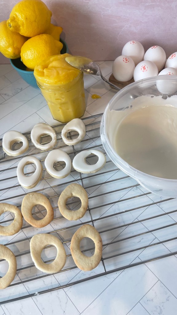 Once you have all the components ready, it’s time to assemble the cookies. Take a cookie base and place a small amount of lemon curd on top of it, spreading it evenly to the edges.