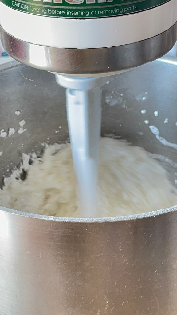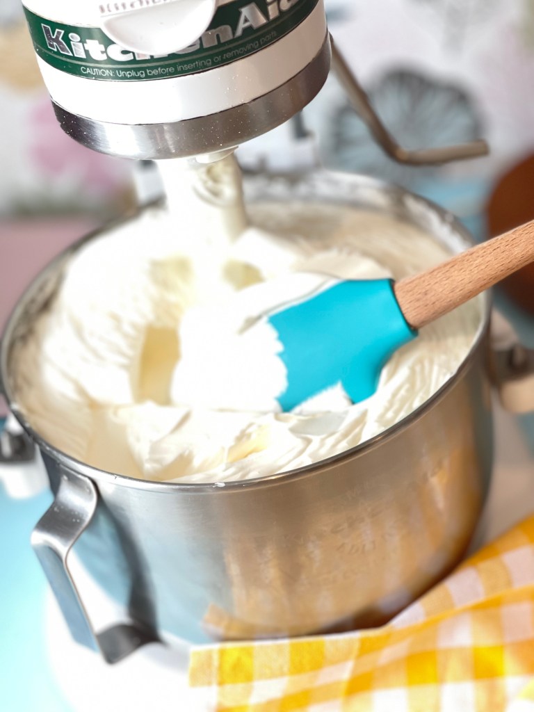 Next, add in your room temperature butter, making sure that 4 oz of it is salted butter (or add salt to your taste preferences). Beat the mixture until it becomes smooth and silky.